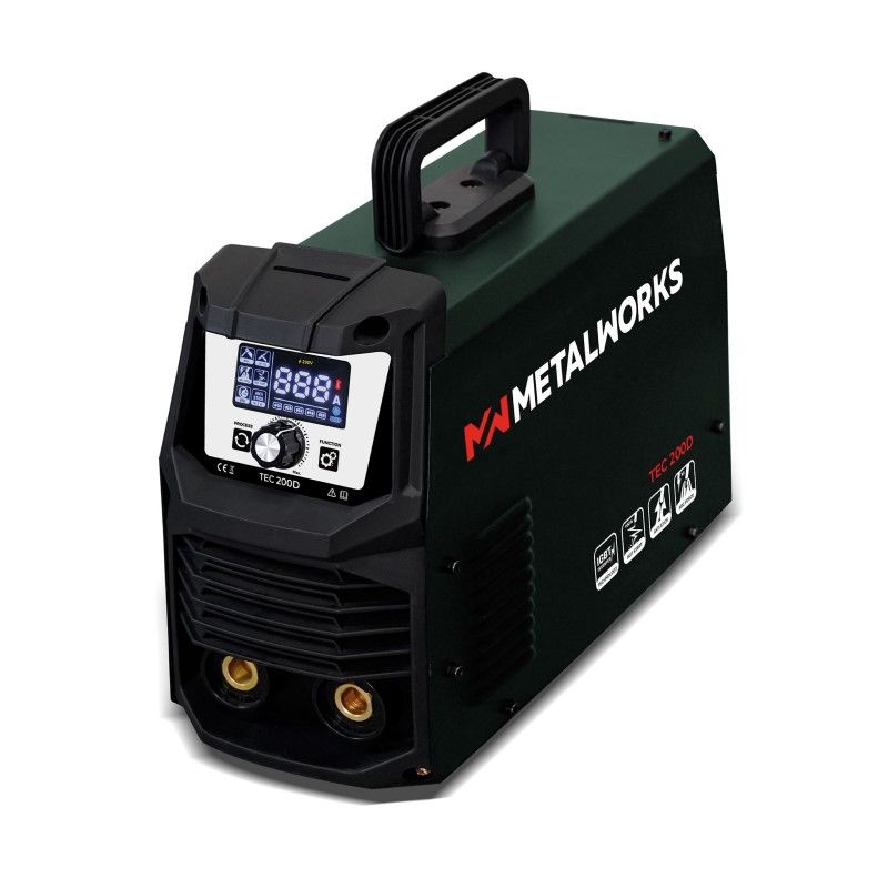 Maquina Soldar Inverter de Metalworks, TEC200D de Metalworks, permite realizar soldaduras a electrodos MMA y TIG LIFT en corriente continua (DC). Destaca por su diseño ligero y compacto, que hace que sea sencillo trasladarla de un lugar a otro.